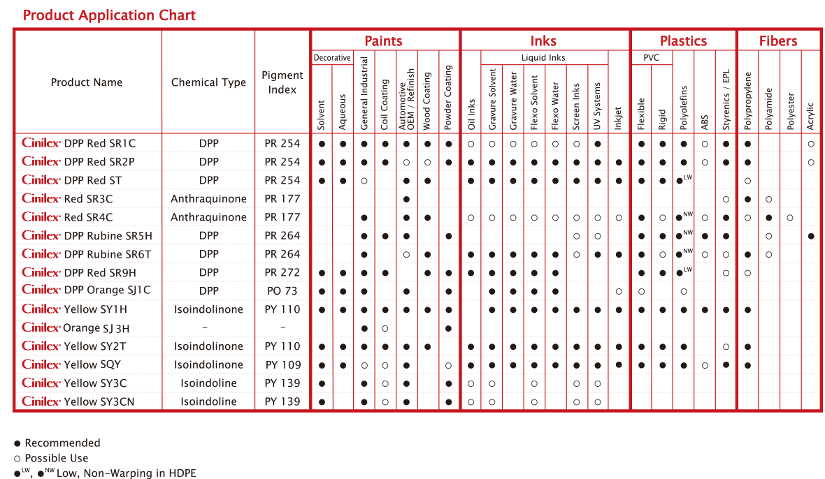 先麗®(Cinilex® )高性能有機(jī)顏料適用于溶劑型、水性等涂料體系,廣泛用于汽車原廠漆、修補(bǔ)漆、建筑涂料、工業(yè)涂料、船舶涂料、防腐涂料等行業(yè)。先麗®(Cinilex®)高性能有機(jī)顏料適用于溶劑型、水性等油墨體系,廣泛用于高耐光、耐候要求的木紋紙裝飾油墨、戶外廣告噴墨以及與食品接觸的包裝油墨、紙張油墨等行業(yè)。